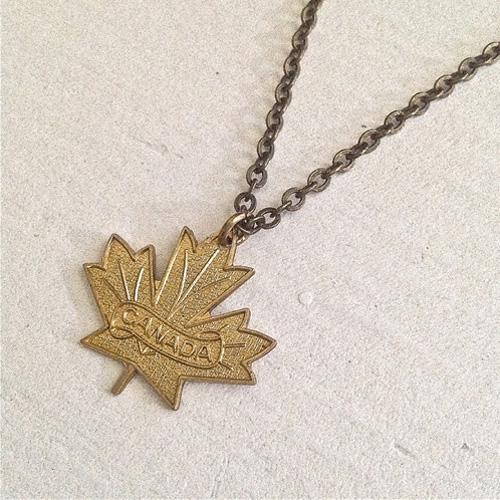 This necklace features a vintage Canadiana maple leaf charm pendant. 17″ bronze chain. Composed of bronze, raw brass. Designed from vintage parts in Canada. Hypoallergenic, nickel and lead free.